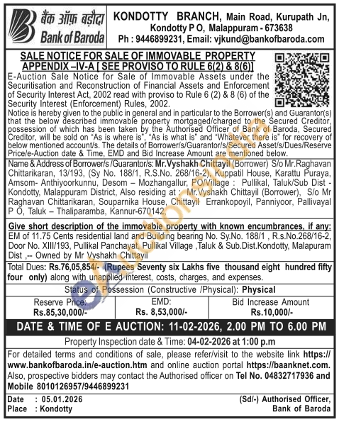 EM of 11.75 Cents residential land and Building bearing No. Sy.No. 188/1, R.s.No.268/16-2, Door No. XIII/193, Pullikal Panchayat, Pullikal Village, Taluk & Sub.Dist. Kondotty, Malapuram Dist, Owned by Mr Vyshakh Chittayil