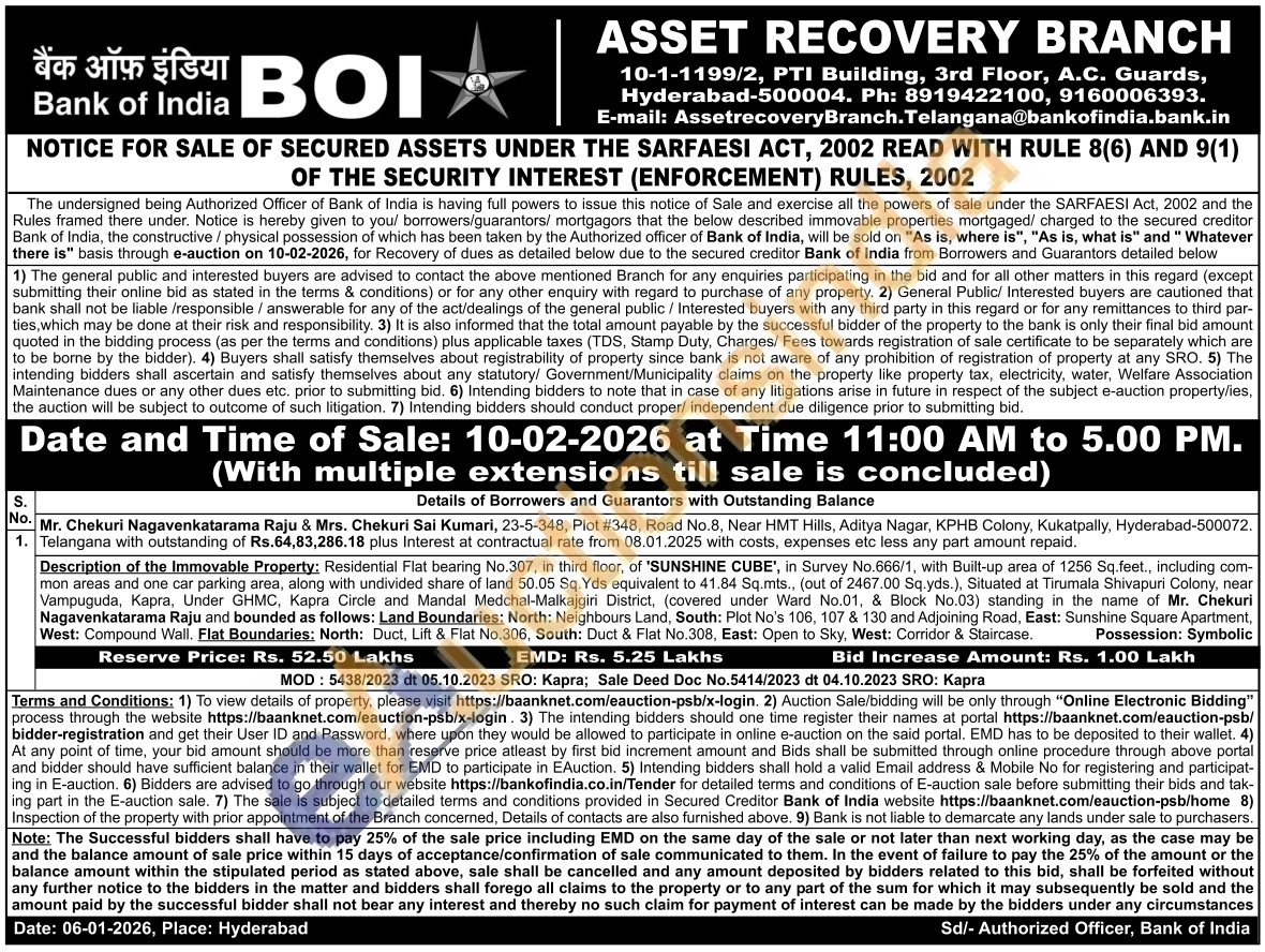 Residential Flat bearing No.307, in third floor, of 'SUNSHINE CUBE', in Survey No.666/1, with Built-up area of 1256 Sq.feet., including com-mon areas and one car parking area, along with undivided share of land 50.05 Sq. Yds equivalent to 41.84 Sq.mts., (out of 2467.00 Sq.yds.), Situated at Tirumala Shivapuri Colony, near Vampuguda, Kapra, Under GHMC. Kapra Circle and Mandal Medchal-Malkajgiri District, (covered under Ward No.01, & Block No.03) standing in the name of Mr. Chekuri Nagavenkatarama Raju and bounded as follows: Land Boundaries: North: Neighbours Land, South: Plot No's 106, 107 & 130 and Adjoining Road, East: Sunshine Square Apartment, West: Compound Wall. Flat Boundaries: North: Duct, Lift & Flat No.306, South: Duct & Flat No.308, East: Open to Sky, West: Corridor & Staircase. Possession: Symbolic