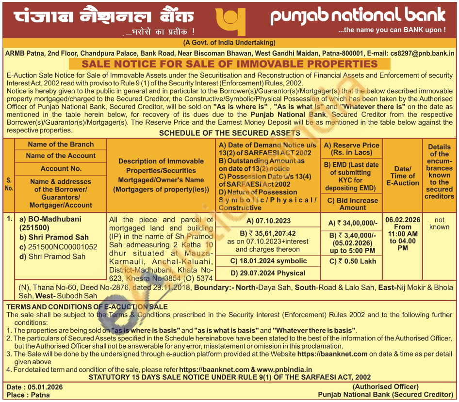 All the piece and parcel of mortgaged land and building (IP) in the name of Sh Pramod Sah admeasuring 2 Katha 10 dhur situated at Mauza-Karmauli, Anchal-Kaluahi, District-Madhubani, Khata No-623, Khesra No-3854 (0) 5374 (N), Thana No-60, Deed No-2876, dated 29.11.2018, Boundary:- North-Daya Sah, South-Road & Lalo Sah, East-Nij Mokir & Bhola Sah, West-Subodh Sah.