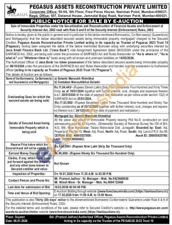 All the piece and parcel of Immovable Property bearing Plot No.9, constructed on land admeasuring area 95.42 Sq.mtrs., (Shreenathji Society) of Revenue Survey No. 100 of B/h. N.G. Mill, Moje Manavadar, Taluka Manavadar Dist. Junagadh. Bounded by: East: Adj. Property of Plot No. 10, West: Adj. Road, North: Adj. Road, South: Adj. Land of R.S. No.99.