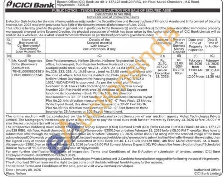 Sree Pottisreeramulu Nellore District, Nelloore Registration District office, Indukurupet, Sub Registrar Nellore Municipal corporation area, Gudipallipadu area, Survey No.234, 236/1. Ac 13-84 cents, Survey No.228, 232, 233, Ac 10.66 cents, total Ac 24.50 cents land along with the land of others, total land is divided into Plots as per layout plan by Nellore Urban Development for housing purpose, FLP NO 3/2021/1031/NUDA/DPMS is approved. As per the layout plan "Anjani Gardens" In 'A' Block Plots according to Survey reports in survey Number 234 Plot No.99 with area 25 Ankanas or 200 Sqyds vacant land and its boundaries:- East: Plot No.100, this direction measurement is 30-0 Feet South: in Anjani Gardens Extension layout Plot No.20, this direction measurement is 60-0" Feet West: 12 Metres Wide layout Road, this direction measurement is 30-0" Feet North: Plot No.98 this direction measurement is 60-0" Feet Between these boundaries 25 Ankanas or 200 Sq.yds Vacant land.