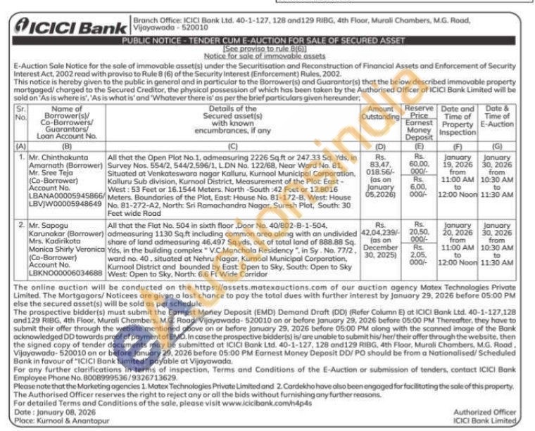 All that the Open Plot No.1, admeasuring 2226 Sq.ft or 247.33 Sq. Yds, in Survey Nos. 554/2, 544/2,596/1, LDN No. 122/68, Near Ward No. 81. Situated at Venkateswara nagar Kalluru, Kurnool Municipal Corporation, Kalluru Sub division, Kurnool District, Measurement of the Plat East-West: 53 Feet or 16.1544 Meters. North-South:42 Feet or 12.8016 Feet wide Road Meters. Boundaries of the Plot, East: House No. 81-172-8, West: House No. 81-272-A2, North: Sri Ramachandra Nagar, Suresh Plot, South: 30