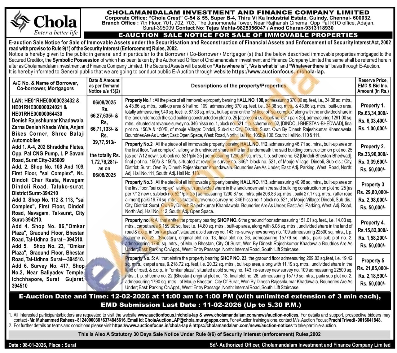 Property no. 4: All that entire the property bearing SHOP NO. 6 the graound floor admeasuring 151.01 sq. feet., i.e. 14.03 sq. mtrs., carpet area & 159.30 sq. feet i.e. 14.80 sq. mtrs., built-up area, along with 8.08 sq. mtrs., undivided share in the land of road & c.o.p. in "omkar plaza", situated at old survey no. 143, re-survey new survey no. 109 admeasuring 22500 sq. mtrs., t. p. scheme no. 22, (Bhestan), original plot no. 13, final plot no. 26, admeasuring 15779 sq. mtrs., paiki sub plot no. 2, admeasuring 1790 sq. mtrs., of Mouje Bhestan, City Of Surat, Won By Dinesh Rajeshkumar Khadawala Boudries Are As Under; East: Parking On Appt., West: Entry Passage, North: Internal Road, South: Lift Staircase.