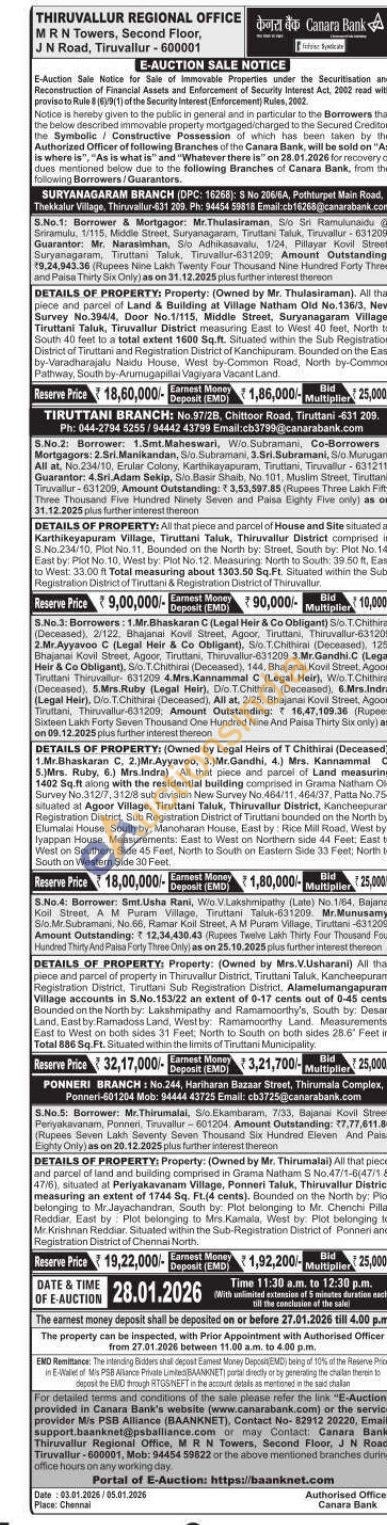 DETAILS OF PROPERTY: Property: (Owned by Mr. Thulasiraman). All tha piece and parcel of Land & Building at Village Natham Old No.136/3, New Survey No.394/4, Door No.1/115, Middle Street, Suryanagaram Village Tiruttani Taluk, Tiruvallur District measuring East to West 40 feet, North to South 40 feet to a total extent 1600 Sq.ft. Situated within the Sub Registration District of Tiruttani and Registration District of Kanchipuram. Bounded on the Eas by-Varadharajalu Naidu House, West by-Common Road, North by-Common Pathway, South by-Arumugapillai Vagiyara Vacant Land