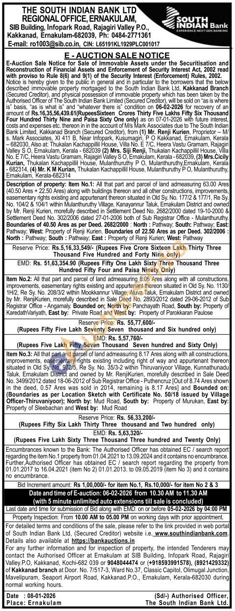 Description of property: Item No.1: All that part and parcel of land admeasuring 63.00 Ares (40.50 Ares + 22.50 Ares) along with buildings thereon and all other constructions, improvements, easementary rights existing and appurtenant thereon situated in Old Sy. No. 177/2 & 177/1, Re Sy. No. 104/2 & 104/1 within Mulanthuruthy Village, Kanayannur Taluk, Emakulam District and owned by Mr. Renji Kurien, morefully described in Settlement Deed No. 2682/2000 dated 19-10-2000 & Settlement Deed No. 302/2006 dated 27-01-2006 both of Sub Registrar Office - Mulanthuruthy. Boundaries of 40.50 Ares as per Deed. 2682/2000: North: Pathway; South: Pathway, East: Pathway, West: Property of Renji Kurien. Boundaries of 22.50 Ares as per Deed, 302/2006: North: Pathway; South: Pathway, East: Property of Renji Kurien; West: Pathway