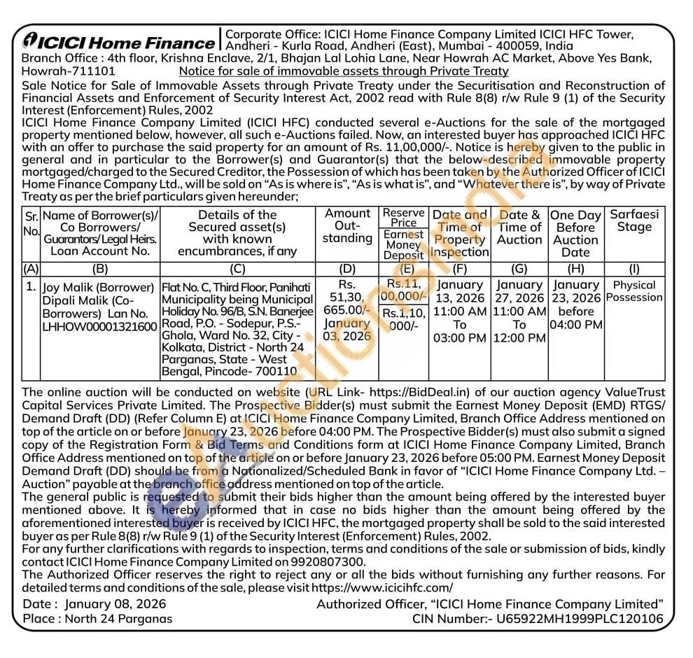 Flat No. C, Third Floor, Panihati Municipality being Municipal Holiday No. 96/B, S.N. Banerjee Road, P.O. - Sodepur, P.S.-Ghola, Ward No. 32, City -Kolkata, District - North 24 Parganas, State - West Bengal, Pincode-700110
