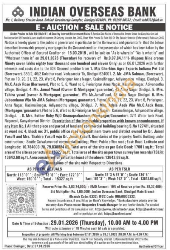 Description of the Immovable properties with known encumbrances, if any Item No.1 All that piece and parcel of land and commercial building bearing S.No 1274/1, situated at ward no: 4, block no: 31, public office road nagapattinam town and district owned by Dr. Jamal Yusuff and Mrs. Thahira Yusuff w/o Dr. Jamal Yusuff. Boundaries of the property: North: Building under construction; South: Galvalume roof commercial building: West: Public office road; East: Road. Latitude and Longitude: 10.784003 (N), 79.838884 (E). Total area of the site as per Sale Deed: 17001 sq.ft: Total area of the site as per actuals: 15327 sq.ft. Total area of the site as per town survey lan records (TSLR): 13643.68 sq.ft. Area considered for valuation least of the above: 13643.68 sq.ft. Dimensions of the site with Respect to Directions