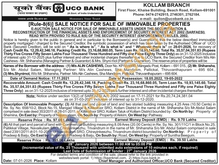 Description Of Immovable Property: (3) All that part and parcel of land and two storied building measuring 4.25 Ares (10.50 Cents) in Re. Sy. No. 658/10-2, Block No. 15, Mangad Village & Killikolloor SRO, Kollam District in the name of Mr. Shihansha S/o Mr.Abdul Salam comprised in sale deed 353/2011 dt 28-01-2011, of Killikolloor SRO, Kollam Taluk of Kollam District bounded by: On North by: Property of Shemina, On East by: Property of Najumudeen, On South by: Property of Akkim, On West by: Pathway.