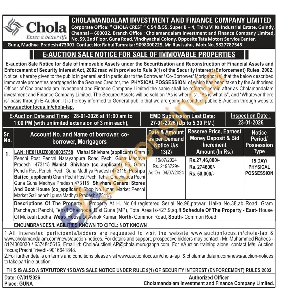 Descriptions Of The Property: Property At H. No.04, registered Serial No.96,patwari Halka No.38,ab Road, Gram Panchayat Penchi, Tehsil Chachoda, Dist Guna (MP), Totai Area Is-427.9, sq.ft Schedule Of The Property - East- House Of Mukesh Lodha, West- House Of Ashok Kumar, North- Common Road, South-Common Road.
