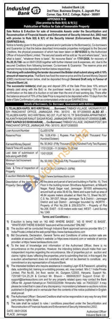 All the piece and parcel of land and building in Flat No. 10, Third Floor in the building known Shivdhara Appartment, at Nikanth Nagar, Ranijt Sagar road, Jamnagar-361005 admeasuring around built up area 39.40 Sq. Metrs and super built up area of 46.84 square meters situated at Ward No. 13, Sheet No.501, C.S. No. 391/207, Mouje: Jamnagar, Ta & District Jamnagar District and sub District Jamnagar bounded by -NORTH-Property of Plot No.208 & 209,SOUTH: Property of Plot No.206, EAST-6.00 meters wide road, WEST-Land Survey No. 1249