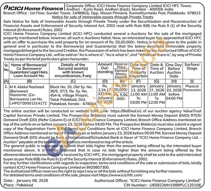 Block No. 20, Old Sy. No. 36/5, 37/3, Re. Sy. No. 454-6, Village Pirayiri, Taluk Palakkad, Dist. Palakkad, Kerala - 678004