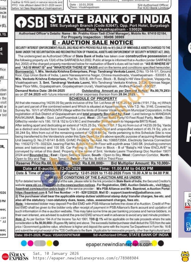 All that site measuring 14235.09 Sq yards inclusive of the Tot-Lot Area off 1425.25 Sq yards (1191.7 Sq. m) Which is part and parcel of the combined extent and Which is situated at Appannapalem, Vide T.D. No. 3146, Covered by Survey No. 161/1 of VEPAGUNTA Village within the limits of Greater Visakhapatnam Municipal Corporation, in the registration of Sub District of Gopalapatnam and total property Bounded by: East: Land belongs to MANDAVA RAVIKUMAR, South: Govt. Land/Porambok Land, West: 25 Feet Road Party/10 Feet Road Partly, North: Site Gifted by vendor no's 150, 151 & 152 to G.V.M.C and thereafter Simhachalam to Vepagunta BRTS Road. After setting apart and dedicating an extent of 1425.25 Sq. Yards (1191.7 Sq.m) from out of 14235.09 Sq. Yards as a distinct and divided Item towards 'Tot- Lot Area', an undivided and unspecified extent of 45.74 Sq. yds or 38.244 Sq. Mtrs from out of the remaining extent of 12809.84 Sq. Yards pertaining to this Schedule Site is now being transferred to the Vendee/s/s under this Sale Deed, for the above specific purpose of acquiring Residential Unit bearing D. No.27-8/141 B-505, GVMC Property Tax Asst. No. 1086573584, Electricity Service Connection No: 1163272175-002324, bearing Flat No. B-505 in Fourth Floor with a plinth area 1340 Sft. (including common areas and balconies) and 100 Sft. Car Parking in Stilt Floor in Block B of "Balaji's Hill View ENCLAVE" is conveyed by virtue of this deed. Property in the name of Smt. Venkata Laxmi Thandrangi Doc Number 1907/2024 and Bounded by: East: Open Setback Space, South: Open to Sky, West: Common Corridor, North: Open to Sky and Top: Open Terrace, Below: Flat No. B-405 in Third Floor.