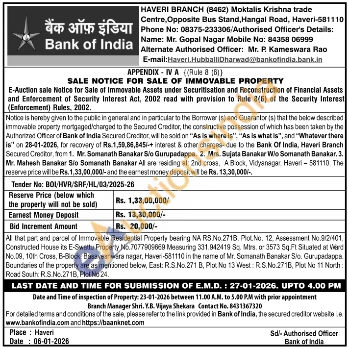 All that part and parcel of Immovable Residential Property bearing NA RS.No.271B, Plot.No. 12, Assessment No.9/2/401, Constructed House its E-Swattu Property No.7077909669 Measuring 331.942419 Sq. Mtrs. or 3573 Sq.Ft Situated at Ward No.09, 10th Cross, B-Block, Basaveshwara nagar, Haveri-581110 in the name of Mr. Somanath Banakar S/o. Gurupadappa. Boundaries of the property are as mentioned below, East: R.S.No.271 B, Plot No 13 West: R.S.No.271B, Plot No 11 North: Road South: R.S.No.271B, Plot No 24