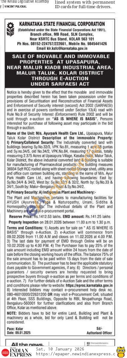 1) Primary/Collateral Security: The Industrially converted land with buildings bearing Sy.No.32/3, VPK No.81, measuring 1 acre 38 guntas and Sy.no.34/5, old No.34/2, VPK.No.84, measuring 17 guntas, totally measuring 2.375 Acres at Upasapura Village, Kasaba Hobli, Malur Taluk, Kolar District, the above industrial converted land & building is suitable for manufacturing of Pharmaceutical products. The building measures 36934 Soft RCC roofed along with sheet roofed Storage shed, utility area and office cum canteen building etc, standing in the name of M/s. Ayur Park Health Care Ltd., and having following boundaries: East by: Sy.No.34/4 & 34/2, West by: Sy.No.32/1 & 32/2, North by. Sy.No.33 & 34/1, South by: Malur-Bengaluru Road & Sy.No.34/2.