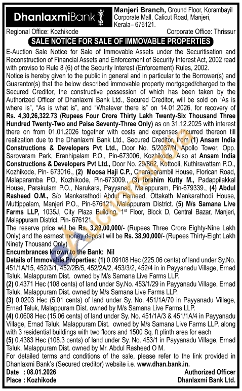 Details of Immovable Properties: (1) 0.09108 Hec (225.06 cents) of land under Sy.No. 451/1A/15, 452/3/1, 452/28/5, 452/2A/2, 453/3/2, 452/4 in in Payyanadu Village, Ernad Taluk, Malappuram Dist. owned by M/s Samana Live Farms LLP. (2) 0.4371 Нес (108 cents) of land under Sy.No. 453/1/29 in Payyanadu Village, Ernad Taluk, Malappuram Dist, owned by M/s Samana Live Farms LLP. (3) 0.0203 Hec (5.01 cents) of land under Sy. No. 451/1A/70 in Payyanadu Village, Ernad Taluk, Malappuram Dist. owned by M/s Samana Live Farms LLP. (4) 0.0608 Hec (15.06 cents) of land under Sy. No. 451/1A/3 & 451/1A/4 in Payyanadu Village, Ernad Taluk, Malappuram Dist. owned by M/s Samana Live Farms LLP. along with 3 residential buildings with two floors and 1500 Sq. ft plinth area for each (5) 0.4383 Hec (108.3 cents) of land under Sy. No. 453/1 in Payyanadu Village, Ernad Taluk, Malappuram Dist. owned by Mr. Abdul Rasheed O M.