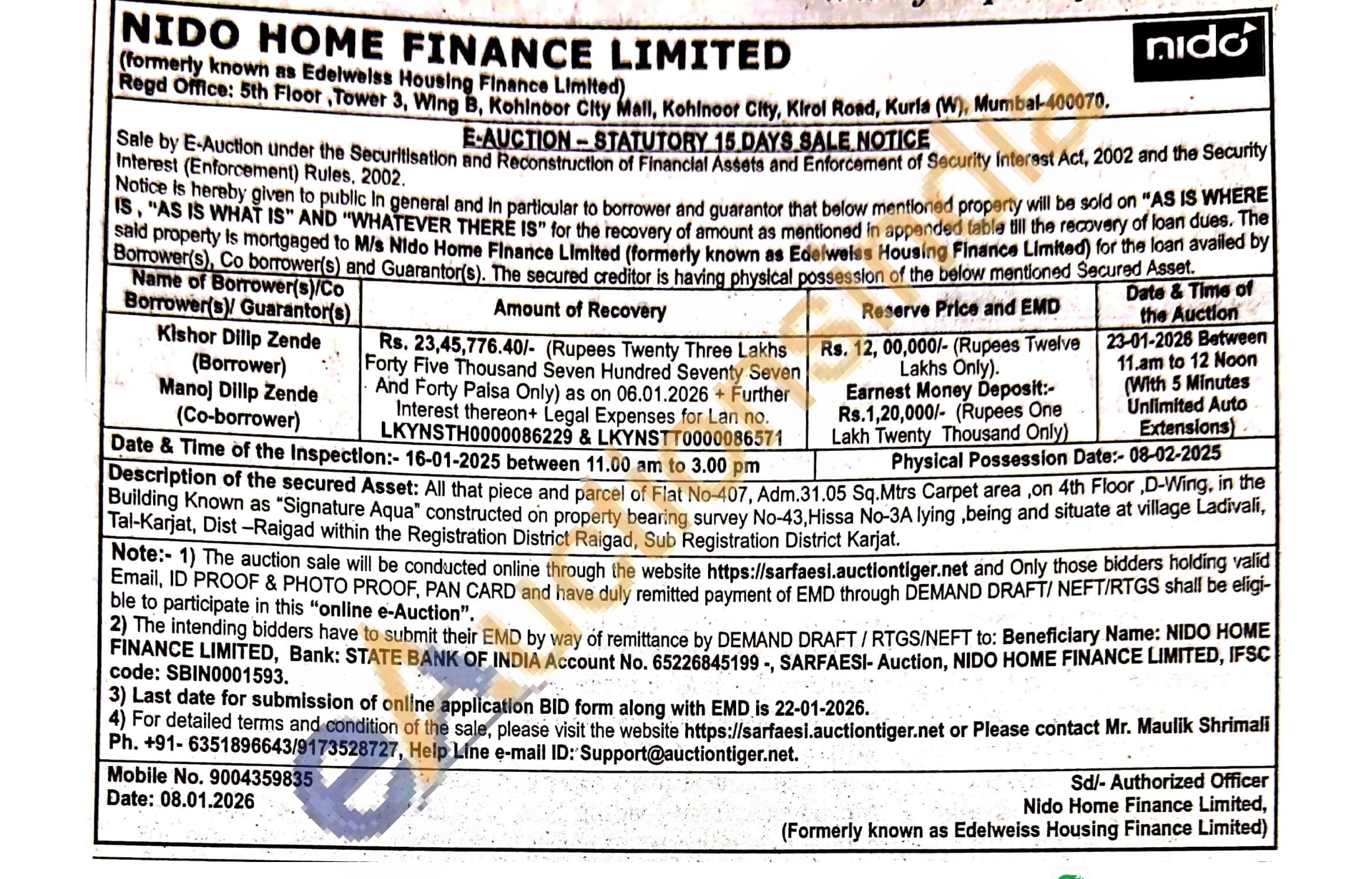 Description of the secured Asset: All that piece and parcel of Flat No-407, Adm. 31.05 Sq.Mtrs Carpet area, on 4th Floor,D-Wing, in the Building Known as "Signature Aqua" constructed on property bearing survey No-43, Hissa No-3A lying, being and situate at village Ladivali, Tal-Karjat, Dist-Raigad within the Registration District Raigad, Sub Registration District Karjat.
