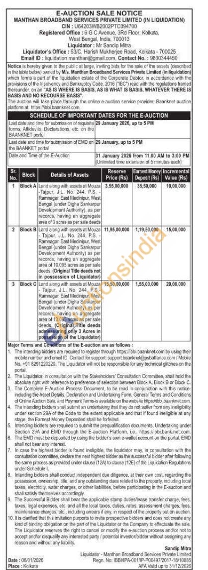 Land along with assets at Mouza Tajpur, J.L. No. 244, P.S.-Ramnagar, East Medinipur, West Bengal (under Digha Sankarpur Development Authority) as per records, having an aggregate area of 13.095 acres as per sale deeds. (Original Title deeds admeasuring only 3 Acres in possession of the Liquidator)