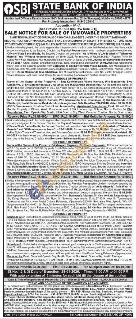 Name of the Owner of the Property: Sri Manyam Nagaraju, S/o Veera Raghavulu: All that part and parcel of 33.0 Sq.yards out of 6583.32 Sq yards South Side out of 16,734.30 Sq.yards of site along with Residentical RCC building constructed thereon in RS Nos. 126 after sub division RS No. 126/3, RS No. 127/2 after sub division RS No. 127/2C, New asst. No. 1073213379. New Ward No. 49, Door No. 19-8-224A, Plinth & Common Area of 916 Sft, Scooter Parking 20 Sft Block-A, 2nd Floor, Flat No.316, Janapriya Apartments, Rajarajeswaripeta, Vidhyadhapuram Village Portion, Vijayawada Municipal Corporation Area, NTR District vide Regd. Sale Deed No.9905/2023, dated: 08.08.2023, JSRO Vijayawada, Krishna District and bounded by: Building Boundaries: East: 40.0 feet wide Municipal Corporation Road, South: Municipal Corporation Road & Others site, West: Others Property, North: Municipal Corporation Park & Road Site. Flat No.316 Boundaries: East: Common Corridor, South: Open to Sky, West: Open to Sky, North: Flat No.317 Property