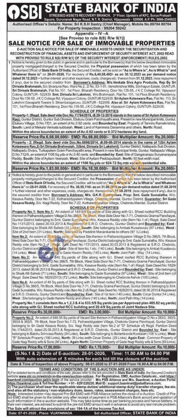 Property-1: (Regd. Sale deed vide Doc. No. 11784/2018, dt. 20-12-2018 stands in the name of Sri Aylam Koteswara Rao): Guntur District, Guntur Sub Division. Etukuru Gram Panchayathi area, Present in new Municipal limits, Guntur, Etukuru Village, D.No. 7/D1, an extent of Ac.0.92 cents and Bounded by: East: Property of Tanniru Ramakrishna, South: Land of Mekala Venkata subbaiah, West: Land of Kammela Danamma and others, North: Road. Within the above boundaries an extent of Ac.0.92 cents or 0.372 hectares dry land.