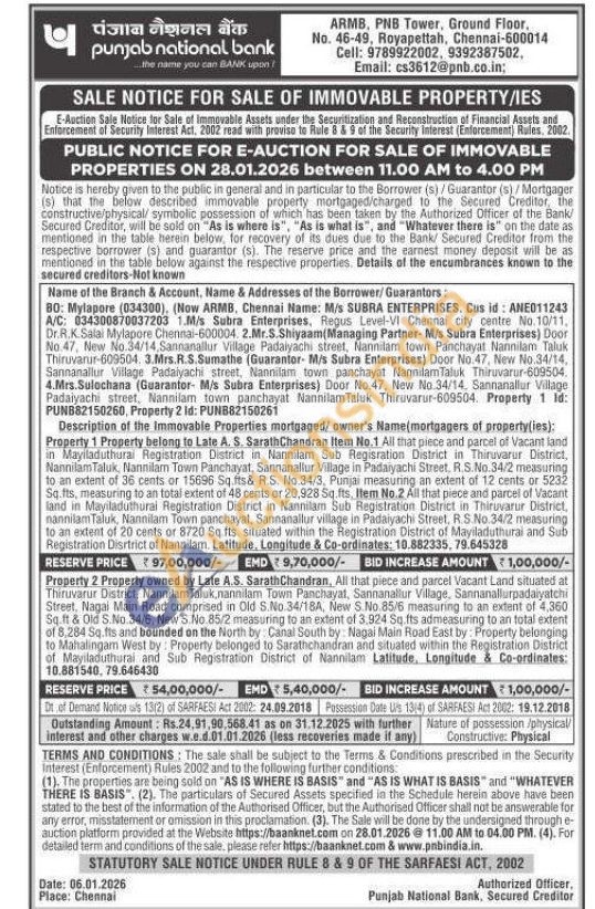 Property 1 Property belong to Late A. S. Sarath Chandran Item No.1 All that piece and parcel of Vacant land in Mayiladuthurai Registration District in Nannilam Sub Regisration District in Thiruvarur District, Nannilam Taluk, Nannilam Town Panchayat, Sannanallur Village in Padalyachi Street, R.S.No.34/2 measuring to an extent of 36 cents or 15696 Sq.fts& R.S. No.34/3, Punjai measuring an extent of 12 cents or 5232 Sq. fts, measuring to an total extent of 48 cents or 20,928 Sq.fts, Item No.2 All that piece and parcel of Vacant land in Mayiladuthurai Registration District in Nannilam Sub Registration District in Thiruvarur District, nannilam Taluk, Nannilam Town panchayat, Sannanallur village in Padalyachi Street, R.S.No. 34/2 measuring to an extent of 20 cents or 8720 Sq fts situated within the Registration District of Mayiladuthurai and Sub Registration District of Nannilam.