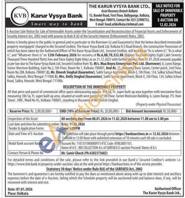 All that piece and parcel of commercial office space admeasuring approx. 918 Sq. Ft. super built up area together with mezzanine floor measuring 106 Sq. Ft. super built up area, situated at south west portion of 5th Floor, Turner Morission Building, 6, Lyons Range, PS: Hare Street, KMC, Ward No 45, Kolkata-700001, standing in the name of Mr. Dinesh Singhal.