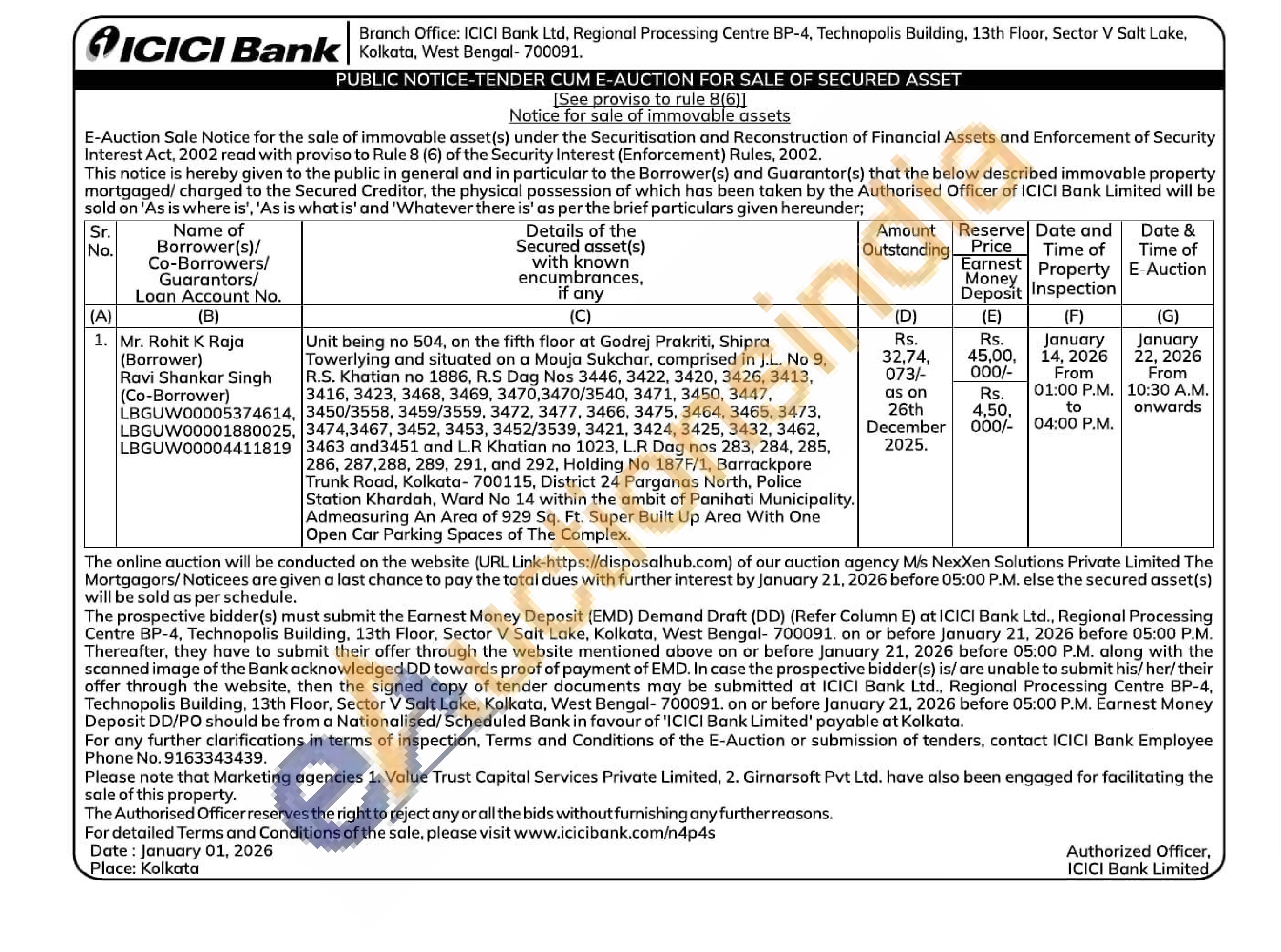 Unit being no 504, on the fifth floor at Godrej Prakriti, Shipra Towerlying and situated on a Mouja Sukchar, comprised in J.L. No 9, R.S. Khatian no 1886, R.S Dag Nos 3446, 3422, 3420, 3426, 3413, 3416, 3423, 3468, 3469, 3470,3470/3540, 3471, 3450, 3447, 3450/3558, 3459/3559, 3472, 3477, 3466, 3475, 3464, 3465, 3473, 3474,3467, 3452, 3453, 3452/3539, 3421, 3424, 3425, 3432, 3462, 3463 and3451 and L.R Khatian no 1023, LR Dag nos 283, 284, 285, 286, 287,288, 289, 291, and 292, Holding No 187F/1, Barrackpore Trunk Road, Kolkata-700115, District 24 Parganas North, Police Station Khardah, Ward No 14 within the ambit of Panihati Municipality. Admeasuring An Area of 929 Sq. Ft. Super Built Up Area With One Open Car Parking Spaces of The Complex.