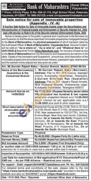 Residential House at D No. 21/3B, Plot no 16, Door no.5-58-30(old), New 27-3-162, old assessment no 5742, New assessment no 1021017763, 3rd line, Krishna Nagar, Near Holy carol church, Cobaltpet, Guntur. On or towards the North: Property of K Daniyelu. On or towards the East: Property belongs to N Ramaswamy. On or towards the West: Property of K Vijayendra Rao, On or towards the South: Municipal Road