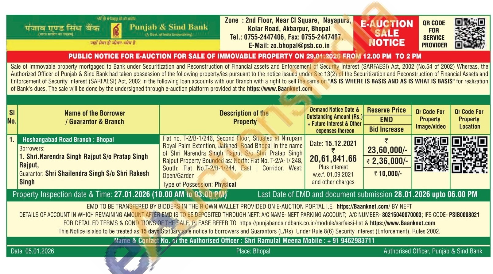 Flat no. T-2/B-1/246, Second Floor, Situated at Nirupam Royal Palm Extention, Jatkhedi Road Bhopal in the name of Shri Narendra Singh Rajput S/o Shri Pratap Singh Rajput Property Bounded as: North: Flat No. T-2/A-1/248, South: Flat No.T-2/B-1/244, East Corridor, West: Open/Garden