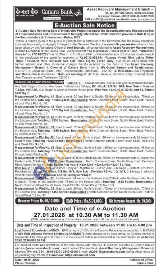 Thiruvannamalai District, Cheyyar Registration District, Arni Sub Regn-District, Ami town, Pudukamoor Village, D/1 Block, T.S.No. 10/1, New Sub-Division T.S.No. 10/1A1E, C.S. Nagar in which a Vacant House plots, Plot Nos. 41,42,43,51,52,53 and 54, Totally 9237 Sq.ft. Measurement for Plot No. 41: East to west: 20 feet. North to South: 69 feet on the western side, 70 feet on the Eastem side, Totalling: 1390 Sq.feet. Boundaries: North: Common Street, South: River, East: Plot No 42 and West: Plot No. 40. Measurement for Plot No. 42: East to west: 20 feet, North to South: 68 feet on the western side, 69 feet on the Eastern side. Totalling: 1370 Sq.feet. Boundaries: North: Common Street, South: River, East: Plot No 43 and West: Plot No. 41.
