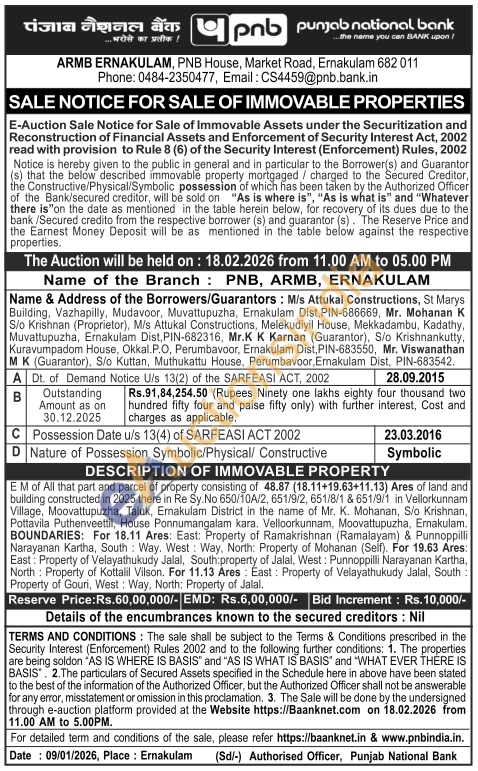 E M of All that part and parcel of property consisting of 48.87 (18.11+19.63+11.13) Ares of land and building constructed in 2025 there in Re Sy. No 650/10A/2, 651/9/2, 651/8/1 & 651/9/1 in Vellorkunnam Village, Moovattupuzha, Taluk, Emakulam District in the name of Mr. K. Mohanan, S/o Krishnan, Pottavila Puthenveettil, House Ponnumangalam kara. Velloorkunnam, Moovattupuzha, Ernakulam. BOUNDARIES: For 18.11 Ares: East: Property of Ramakrishnan (Ramalayam) & Punnoppilli Narayanan Kartha, South Way. West Way, North: Property of Mohanan (Self). For 19.63 Ares: East: Property of Velayathukudy Jalal, South: property of Jalal, West: Punnoppilli Narayanan Kartha, North Property of Kottalil Vilson. For 11.13 Ares: East: Property of Velayathukudy Jalal, South: Property of Gouri, West: Way, North: Property of Jalal,
