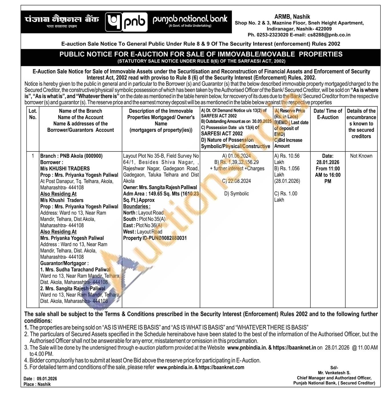 Layout Plot No 35-B, Field Survey No 64/1, Besides Shiva Nagar,, Rajeshwar Nagar, Gadegaon Road, Gadegaon, Taluka Telhara and Dist Akola Owner: Mrs. Sangita Rajesh Palliwal Adm Area: 149.65 Sq. Mts (1610.23 Sq. Ft.) Approx Boundaries: North: Layout Road South: Plot No 35(A) East: Plot No 36(A) West: Layout Road Property ID-PUNB0082880031