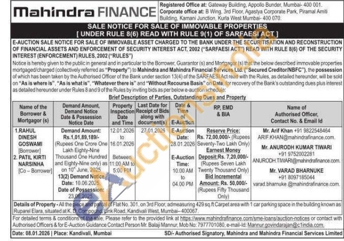 Details of Property-All the piece and parcel of Flat No. 301, on 3rd Floor, admeasuring 429 sq.ft Carpet area with 1 car parking space in the building known as Ruparel Elara, situated at K. D. Compound. Link Road, Kandivali West, Mumbai-400067.