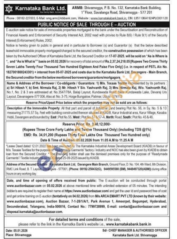 Description of the Immovable Property. All that part and parcel of Industrial Land bearing Plot No. 56, in Sy. No. 5 & 13 measuring 21775.57 Sq. Feet with building constructed thereon situated at KIADB, Karur Industrial area, Karur Village, Kasaba Hobli, Davangere and bounded by: East: Plot No.55, West: Plot No. 57 857-A, North: Road, South: Plot No. 45 & 46.