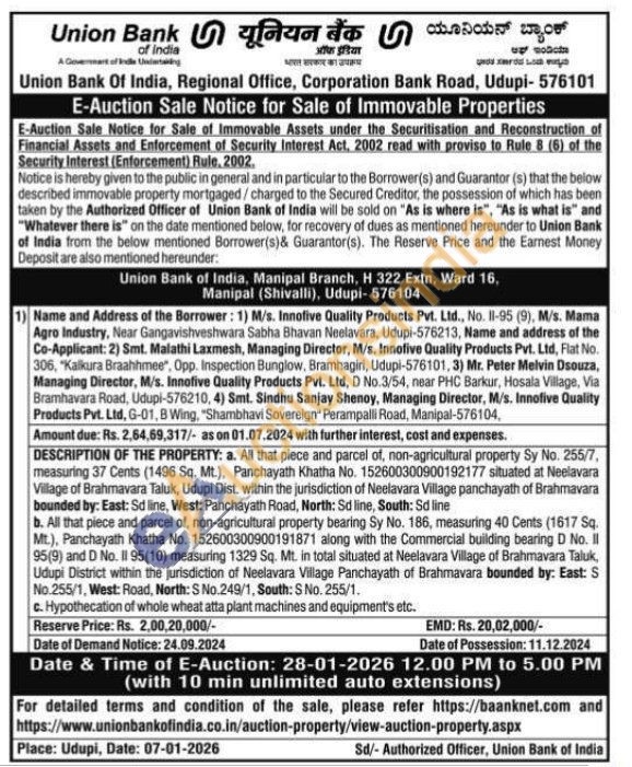 DESCRIPTION OF THE PROPERTY: a. All that piece and parcel of, non-agricultural property Sy No. 255/7, measuring 37 Cents (1496 Sq. Mt.), Panchayath Khatha No. 152600300900192177 situated at Neelavara Village of Brahmavara Taluk, Udupi Dist. within the jurisdiction of Neelavara Village panchayath of Brahmavara bounded by: East: Sd line, West: Panchayath Road, North: Sd line, South: Sd line b. All that piece and parcel of, non-agricultural property bearing Sy No. 186, measuring 40 Cents (1617 Sq. Mt.), Panchayath Khatha No. 152600300900191871 along with the Commercial building bearing D No. II 95(9) and D No. II 95(10) measuring 1329 Sq. Mt. in total situated at Neelavara Village of Brahmavara Taluk, Udupi District within the jurisdiction of Neelavara Village Panchayath of Brahmavara bounded by: East: S No.255/1, West: Road, North: S No.249/1, South: S No. 255/1.