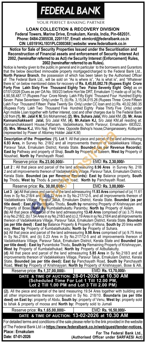 Lot 3: (a) All that piece and parcel of the land admeasuring 11.93 Ares comprised of (a) 11.61. Ares in Sy No.218/4 and (b) 0.32 Ares in Sy No.217/12-5, and all improvements thereon of Vadakkekkara Village, Paravur Taluk, Ernakulam District, Kerala State. Bounded (as per title deed): East by Purmbokku Thodu, South by remaining Property of Krishnayyan and Property of Bose, West by Kumbalathukattu Parambu; North by Property of Aslam. (b) All that piece and parcel of the land admeasuring 13.48 Ares comprised of (a) 3.75 Ares in sy No.218/2, (b) 7.54 Ares in sy No.218/3 and (c) 2.19 Ares in sy No.218/4 and all improvements thereon of Vadakkekkara Village, Paravur Taluk, Ernakulam District, Kerala State. Bounded (as per title deed): East by Balance Property & Property of Misna, South by 20 links width way. West by Property of Kumbalathukattu; North by Property of Suhara. (c) All that piece and parcel of the land admeasuring 9.98 Ares comprised of (a) 9.75 Ares in Sy No.218/4, and (b) 0.23 Ares in Sy No.217/12-5 and all improvements thereon of Vadakkekkara Village, Paravur Taluk, Ernakulam District, Kerala State and Bounded (as per title deed): East by Puramboke Thodu, South by Remaining Property of Krishnayyan, West by Property of Kumbalathukad; North by Property of Adbullakutty. (d) All that piece and parcel of the land admeasuring 5.85 Ares in Sy No.218/3 and all improvements thereon of Vadakkekkara Village, Paravur Taluk, Ernakulam District, Kerala State. Bounded (as per title deed): East by Panchayath Road, South by Panchayath Road, West by Property of Krishnayyan; North by Property of Krishnayyan, Bose & Alli