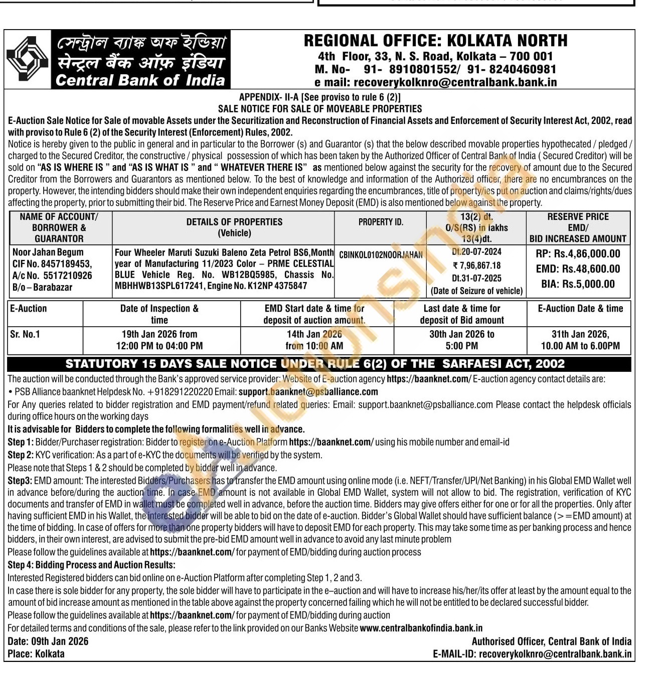 Four Wheeler Maruti Suzuki Baleno Zeta Petrol BS6, Month year of Manufacturing 11/2023 Color PRME CELESTIAL BLUE Vehicle Reg. No. WB12BQ5985, Chassis No. MBHHWB13SPL617241, Engine No. K12NP 4375847