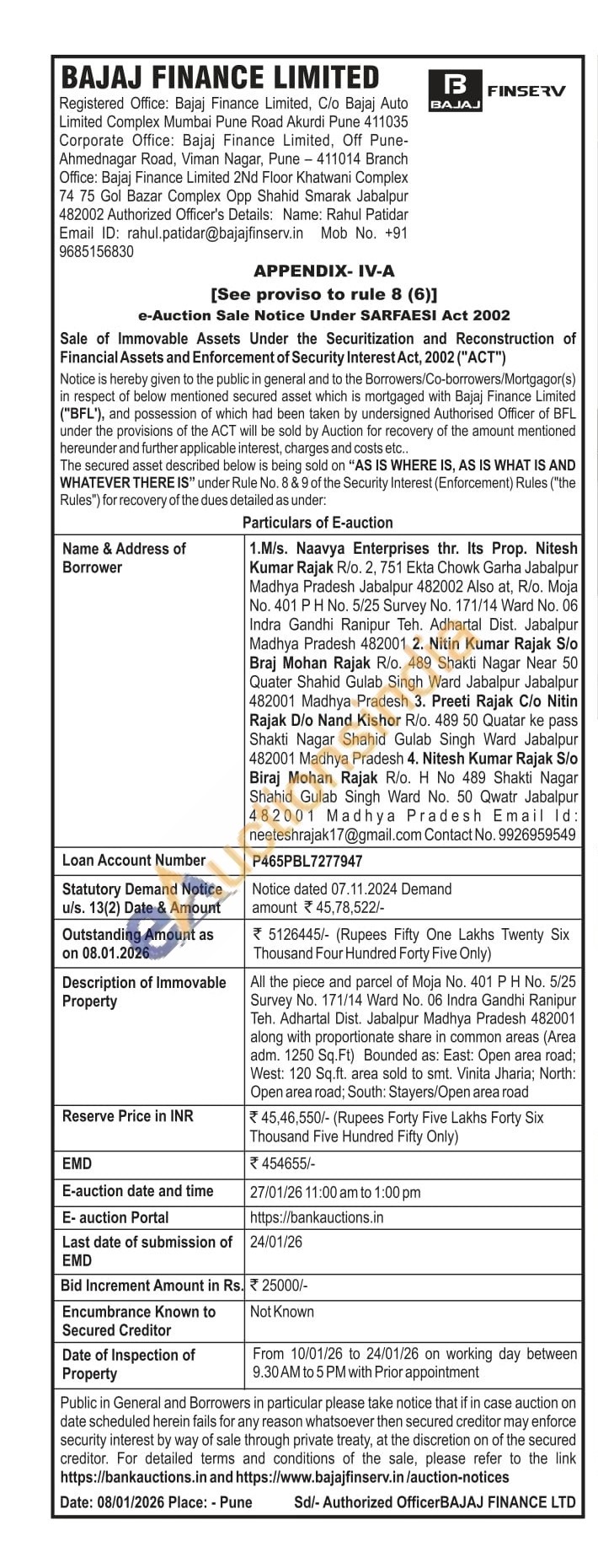 All the piece and parcel of Moja No. 401 PH No. 5/25 Survey No. 171/14 Ward No. 06 Indra Gandhi Ranipur Teh. Adhartal Dist. Jabalpur Madhya Pradesh 482001 along with proportionate share in common areas (Area adm, 1250 Sq.Ft) Bounded as: East: Open area road; West: 120 Sq ift, area sold to smt. Vinita Jharia; North: Open area road, South: Stayers/Open area road