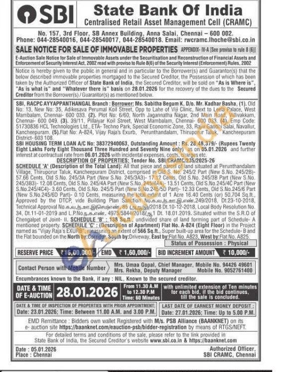 SCHEDULE 'A' (Description of the Total Land): All that piece and parcel of land situated at Perunthandalam Village, Thiruporur Taluk, Kancheepuram District, comprised in Old S. No. 245/2 Part (New S.No. 245/28)-57.66 Cents, Old S No. 245/3A Part (New S.No. 245/3A3)- 17.12 Cents, Old S.No. 245/38 Part (New S.No. 245/383)-12.08 Cents, Old S.No. 245/4A Part (New S.No. 245/4A4)-13.51 Cents, Old S.No.245/40 Part (New S.No.245/404)-3.60 Cents, Old S.No. 245/5 Part (New S.No. 245/50 Part)-12.33 Cents, Old S.No.245/6 Part (New S.No.245/60 Part)- 0.10 Cents, measuring the total extent of 1 Acre 16.40 Cents (or) 50,704 Sq.ft., Approved by the DTCP, vide Building Plan Sanction No.....249/2018. Dt.23-10-2018, Technical Approval No.... 85 (01/2018 Dt.10-12-2018, Local Body Resolution No. 34. Dt.11-01-2019 and L.P.No.5.5. 4975/5844/2018/1 Dt. 18.01.2019. Situated within the S.R.O of Chengalpet of Joint- II. SCHEDULE 'B': 138 Sq.ft., undivided share of land forming part of Schedule- A mentioned property SCHEDULE 'C' (Description of Apartment) Flat No. A-824 (Eight Floor) in the Project named as "Vijay Raja's EXURB", measuring an extent of 566 Sq.ft., Super built-up area for the Schedule-B and the Flat bounded on the North by: Corridor, South by: Driveway, East by:Flat No. A823, West by:Flat. No. A825