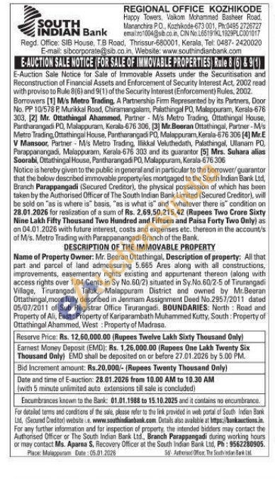 Name of Property Owner: Mr. Beeran Ottathingal, Description of property: All that part and parcel of land admeasuring 5.665 Ares along with all constructions, improvements, easementary rights existing and appurtenant thereon (along with access rights over 1.04 Cents in Sy No. 60/2) situated in Sy.No.60/2-5 of Tirurangadi Village, Tirurangadi Taluk, Malappuram District and owned by Mr.Beeran Ottathingal, more fully described in Jenmam Assignment Deed No.2957/2011 dated 05/07/2011 of Sub Registrar Office Tirurangadi, BOUNDARIES: North: Road and Property of Ali, East: Property of Kariparambath Muhammed Kutty, South: Property of Ottathingal Ahammed, West: Property of Madrasa