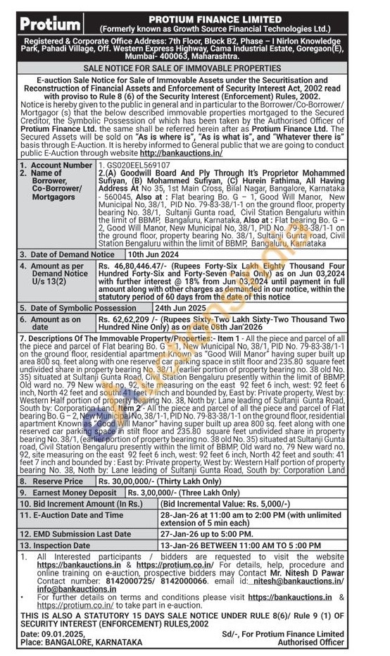 Descriptions Of The Immovable Property/Properties:- Item 1- All the piece and parcel of all the piece and parcel of Flat bearing Bo. G-1, New Municipal No, 38/1, PID No. 79-83-38/1-1 on the ground floor, residential apartment Known as "Good Will Manor having super built up area 800 sq. feet along with one reserved car parking space in stilt floor and 235.80 square feet undivided share in property bearing No. 38/1, (earlier portion of property bearing no. 38 old No. 35) situated at Sultanji Gunta Road, Civil Station Bengaluru presently within the limit of BBMP, Old ward no. 79 New ward no. 92, site measuring on the east 92 feet 6 inch, west: 92 feet 6 inch, North 42 feet and south: 41 feet 7 inch and bounded by, East by: Private property, West by: Western Half portion of property bearing No. 38, Noth by: Lane leading of Sultanji Gunta Road, South by: Corporation Land, Item 2-All the piece and parcel of all the piece and parcel of Flat bearing Bo. G-2, New Municipal No. 38/1-1, PID No. 79-83-38/1-1 on the ground floor, residential apartment Known as "Good Will Manor" having super built up area 800 sq. feet along with one reserved car parking space in stilt floor and 235.80 square feet undivided share in property bearing No. 38/1, (earlier portion of property bearing no. 38 old No. 35) situated at Sultanji Gunta road, Civil Station Bengaluru presently within the limit of BBMP, Old ward no. 79 New ward no. 92, site measuring on the east 92 feet 6 inch, west: 92 feet 6 inch, North 42 feet and south: 41 feet 7 inch and bounded by: East by: Private property, West by: Western Half portion of property bearing No. 38, Noth by: Lane leading of Sultanji Gunta Road, South by: Corporation Land