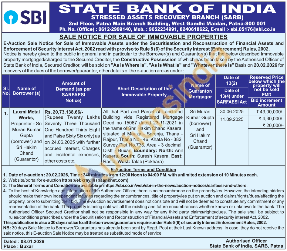 All that Part and Parcel of Land and Building vide Registered Mortgage Deed no 15067 dated 23-11-2021 in the name of Shri Hakim Chand Kasera, situated at Mauza Sarenja, Thana -Rajpur, Thana No - 46, Khata No - 382, Survey Plot No.736, Area - 3 decimal, Distt Buxar. Boundary: North: Anil Kasera, South: Suresh Kasera, East: Rasta, West: Talab (Pokhara)