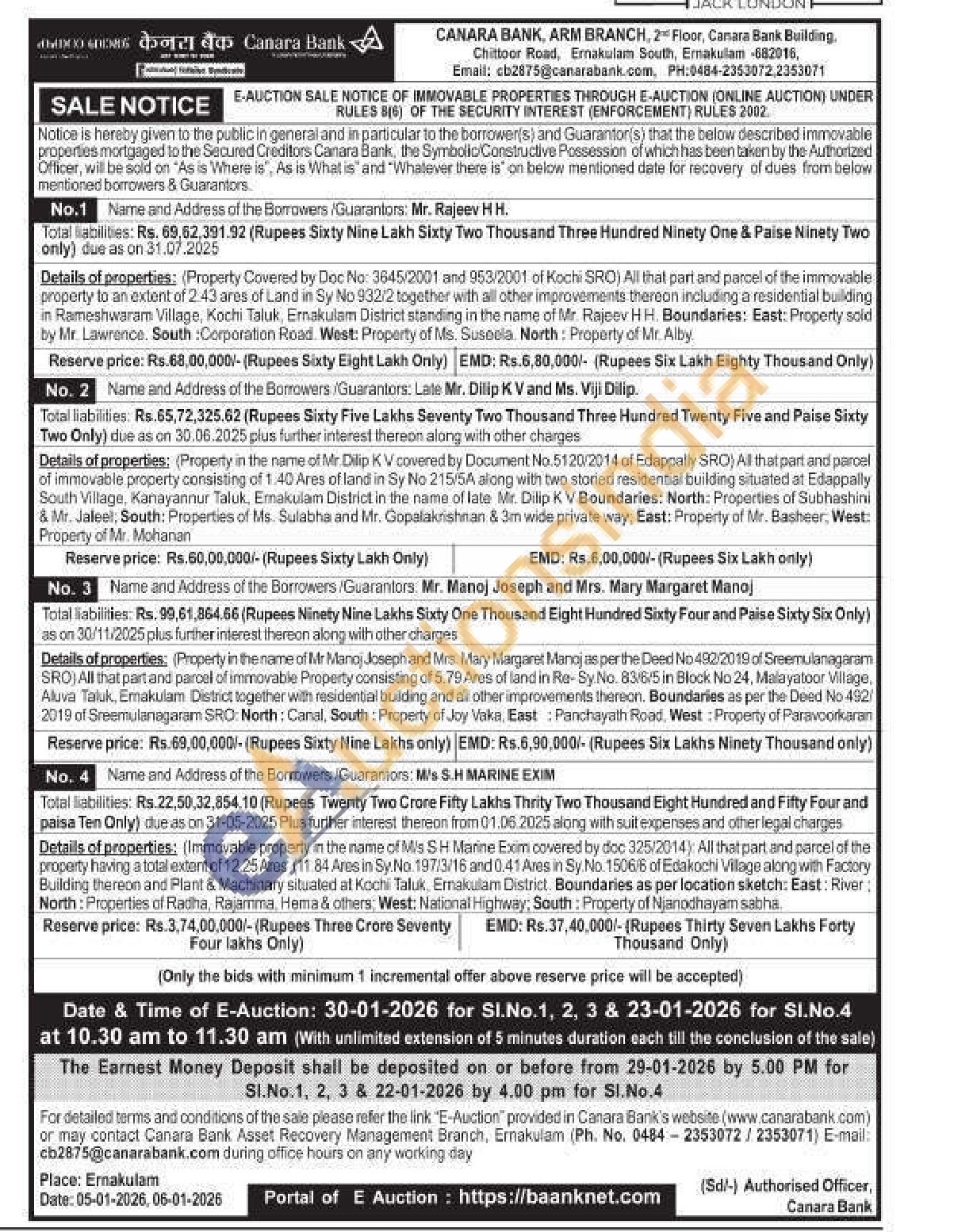 Details of properties: (Immovable property in the name of Mis SH Marine Exim covered by doc 325/2014): All that part and parcel of the property having a total extant of 12.25 Ares (11.84 Ares in Sy.No. 197/3/16 and 0.41 Ares in Sy. No. 1506/6 of Edakochi Village along with Factory Building thereon and Plant & Machinary situated at Kochi Taluk, Ernakulam District. Boundaries as per location sketch: East: River North: Properties of Radha, Rajamma, Hema & others; West: National Highway; South: Property of Njanodhayam sabha