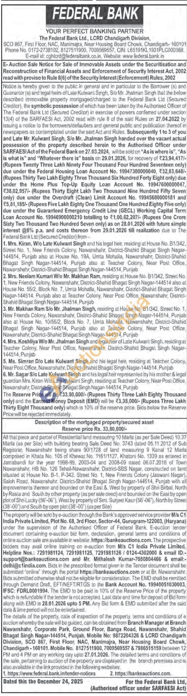 All that piece and parcel of Residential land measuring 10 Marla (as per Sale Deed) 10.37 Marla (as per Site) with building bearing Sale Deed No. 3743 dated 05.11.2012 of Sub Registrar, Nawanshahr being share 90/1728 of land measuring 9 Kanal 12 Marla comprised in Khata No. 105 of Khewat No. 1161/1127, Khatoni No. 1339 as entered in Jamabandi for the year 1998-99, 2003-04 and 2008-09 dated 06.07.2016 of Town Nawanshahr, HB No. 126 Tehsil-Nawanshahr, District-SBS Nagar, constructed on land situated at House No. B-1, P-342, Street No. 1, New Friends Colony (Jaswant Nagar), Saloh Road, Nawanshahr, District-Shahid Bhagat Singh Nagar-144514, Punjab with all improvements thereon and bounded on the East &, West by properly of Shri Birbal, North by Rasta and South by other property (as per sale deed) and bounded on the East by open plot of Shri Lucky (56'-06"), West by property of Smt. Surjeet Kaur (56'-06"), North by Street (38'-00") and South by open plot (38'-00") (as per Site)