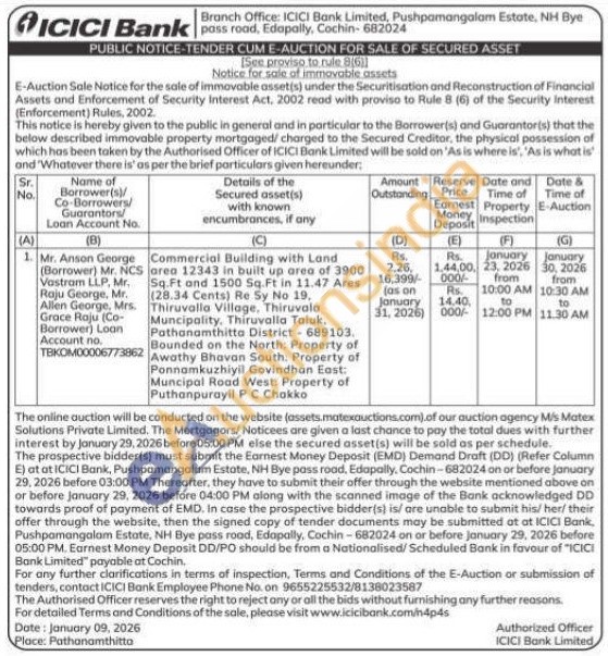 Commercial Building with Land area 12343 in built up area of 3900 Sq.Ft and 1500 Sq.Ft in 11.47 Ares (28.34 Cents) Re Sy No 19, Thiruvalla Village, Thiruvala Muncipality, Thiruvalla Taluk. Pathanamthitta District-689103. Bounded on the North: Property of Awathy Bhavan South: Property of Ponnamkuzhiyil Govindhan East: Muncipal Road West: Property of Puthanpurayil PC Chakko