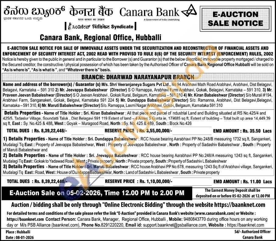 All that piece and parcel of industrial Land and Building situated at RS No.425/4 and 425/5, Tadaslur Village, Soundatti Taluk, Dist Belagavi 591 119 Extent of land -4 Acres 5 Gunta ie, 179685 sq ft, Extent of building - Total built up area 14,449.39 sq ft, East: Sy. No.425 & 488, West: Goyak - Muragood Road, North: Sy. No. 425 & 489, South: Block No.426