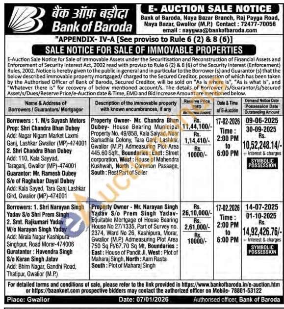 Property Owner- Mr. Chandra Bhan Dubey House Bearing Municipal Property No. 49/858, Kala Saiyad, Near Samadhia Colony, Tara Ganj, Lashkar, Gwalior (M.P.) Admeasuring Plot Area 445.60 Sqft., Boundaries: East: Street corporation, West: House of Mahendra Kushwah, North Common Passage, South: Rest Part of Seller