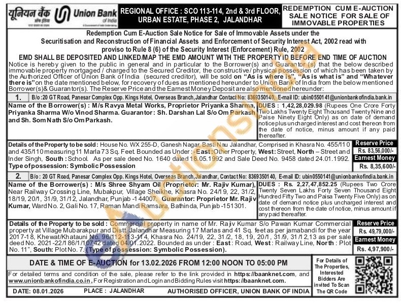 Details of the Property to be sold: Commercial property in name of Mr. Rajiv Kumar S/o Pawan Kumar Commercial property at Village Mubarakpur and Distt Jalandhar Measuring 17 Marlas and 41 Sq. feet as per jamabandi for the year 2017-18, Khewat/Khatauni No. 96/112-113-114, Khasra No. 24/19, 22, 31/2, 18, 19, 20/1, 31/9, 31/12,13 as per sale deed No. 2021-22/186/1/10742 dated 04.01.2022. Bounded as under: East: Road, West: Railway Line, North: Plot No. 11", South: Plot No. 7. (Type of possession: Symbolic Possession).