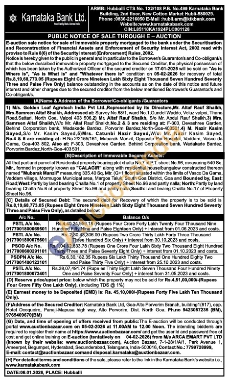 All that part and parcel of Residential property bearing plot chalta No.7 of P.T. sheet No.96, measuring 540 Sq. Mtr., formed in property known as "CALAGIR" along with residential house/bungalow constructed thereon named "Mubarak Manzil" measuring 335.40 Sq. Mtr. (G+1 floor) situated within the limits of Vasco Da Gama, Vaddam village, Mormugoa Municipal area, Margoa Taluk, South Goa District, Goa and Bounded by, East: Road West: Partly by land bearing Chaita No. 1 of property Sheet No.96 and partly nalla; North: Partly by land bearing Chalta No.6 of property Sheet No.96 and partly nalla: South: Land beaing Chalta No.17 of Property Sheet No.96.