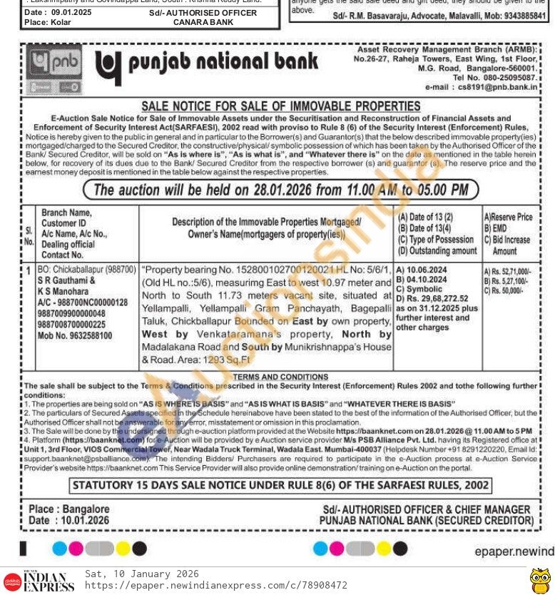 Property bearing No. 152800102700120021 HL No: 5/6/1, (Old HL no.:5/6), measuring East to west 10.97 meter and North to South 11.73 meters vacant site, situated at Yellampalli, Yellampalli Gram Panchayath, Bagepalli Taluk, Chickballapur Bounded on East by own property, West by Venkataramana's property, North by Madalakana Road and South by Munikrishnappa's House & Road. Area: 1293 Sq. Ft