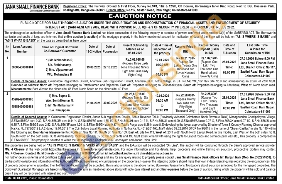 Details of Secured Assets: Coimbatore Registration District, Anamalai Sub Registration District, Anamalai Taluk, Kottur Village, in S.F. No.1487/1C,10in this Site No.9 and admeasuring an extent of 2200 Sq.ft. Bounded as follows: North of: Properties belonging to Pattabiraman and Rajendran, East of: Properties belonging to Gnanabakkiyam, South of: Properties belonging to Arbutharaj, West of: North South road. Measurements: East Weston the either side: 55 Feet, North South on the either side: 40 Feet.